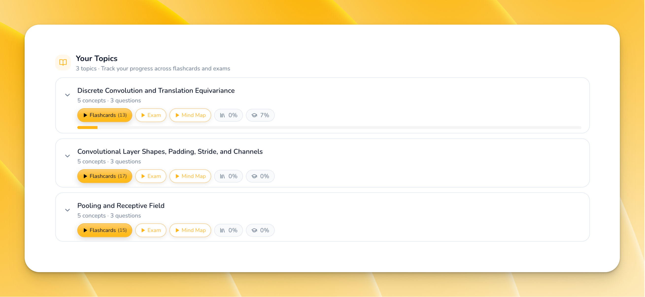 Wie nutzen Studierende unseren Lernleitfaden-Generator? Die meisten laden ihre Vorlesungsfolien oder Lehrbuchkapitel zu Beginn einer Lernsitzung hoch. Die KI erstellt einen vollständigen Lernleitfaden mit organisierten Themen, Schlüsselkonzepten und Selbsttest-Fragen. Studierende arbeiten Themen systematisch durch und nutzen die integrierte Fortschrittsverfolgung, um sich auf Bereiche zu konzentrieren, die mehr Wiederholung brauchen.